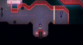 Vermillion Tower consists of six small floors connected by an elevator. The ground floor consists of an entrance chamber and an elevator room, while the first and second floors each have two loops of puzzle rooms. The third and fourth floors consist of a single room each, consisting of a boss battle and a final bounce puzzle respectively. The elevator banner initially implies that there will be many more floors, but after the fourth floor the elevator goes all the way to the top.